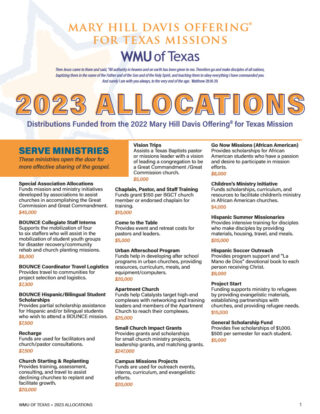 The Allocation Report details how your gifts to the Mary Hill Davis Offering for Texas Missions are allocated to Texas Baptists missionaries and ministries.
